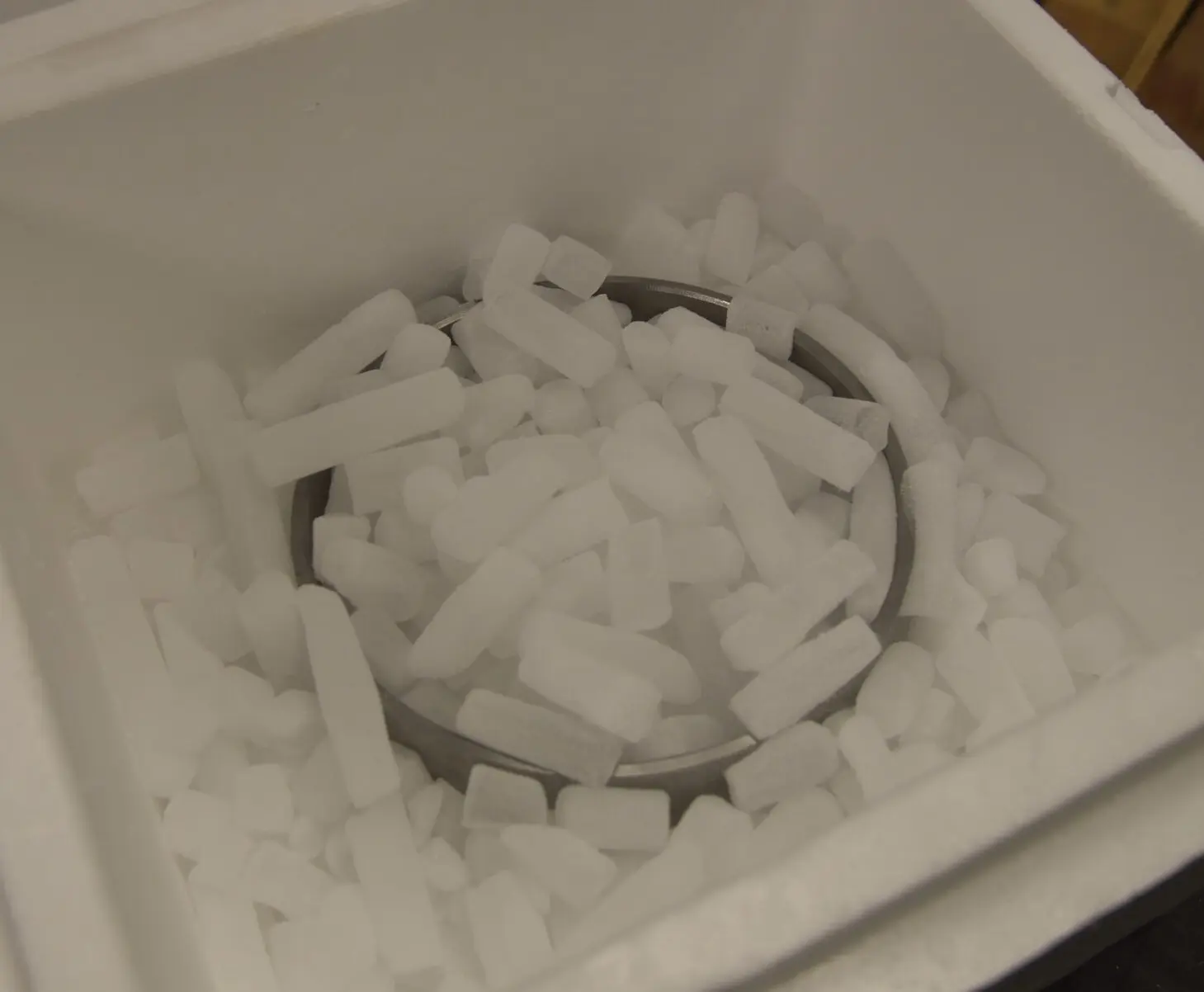 Door de temperatuur van -78,5°C krimpen materialen die daar enige tijd in droogijs worden bewaard. Kunststof lagerschalen of pas pennen.