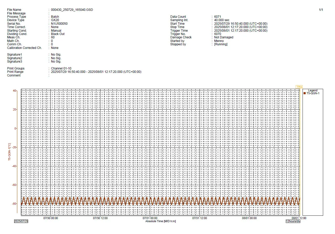 Belangrijk is dat gedurende de opslag de temperatuur aangetoond kan worden binnen welke grenzen die zijn gebleven. Wij werken sinds het begin in 1999 met Yokogawa meetsystemen. Voor de langdurige opslag gebruiken wij een volledig gevalideerde GX20 met security module.